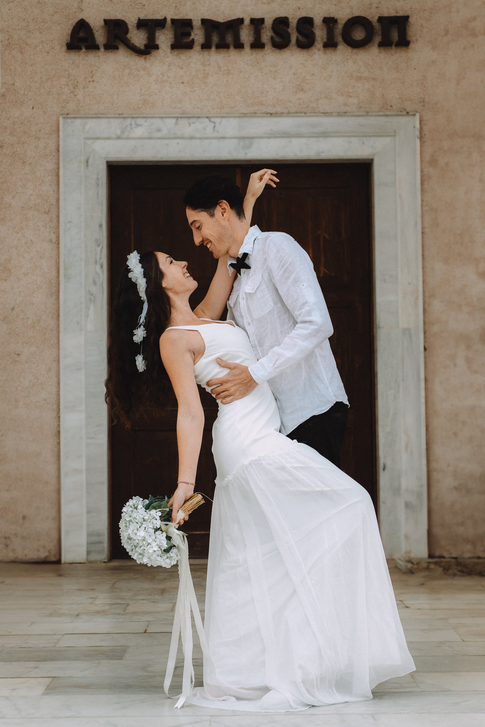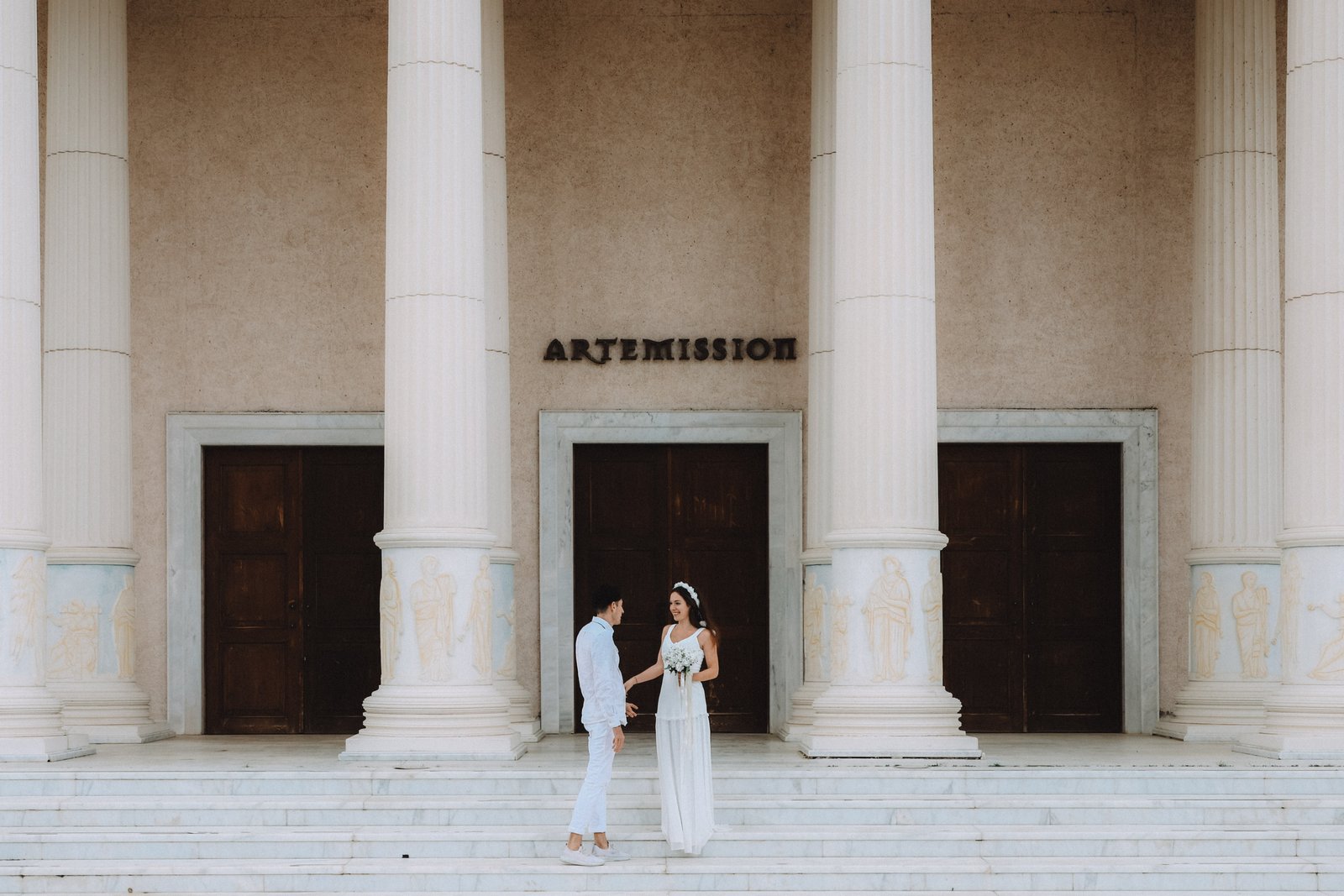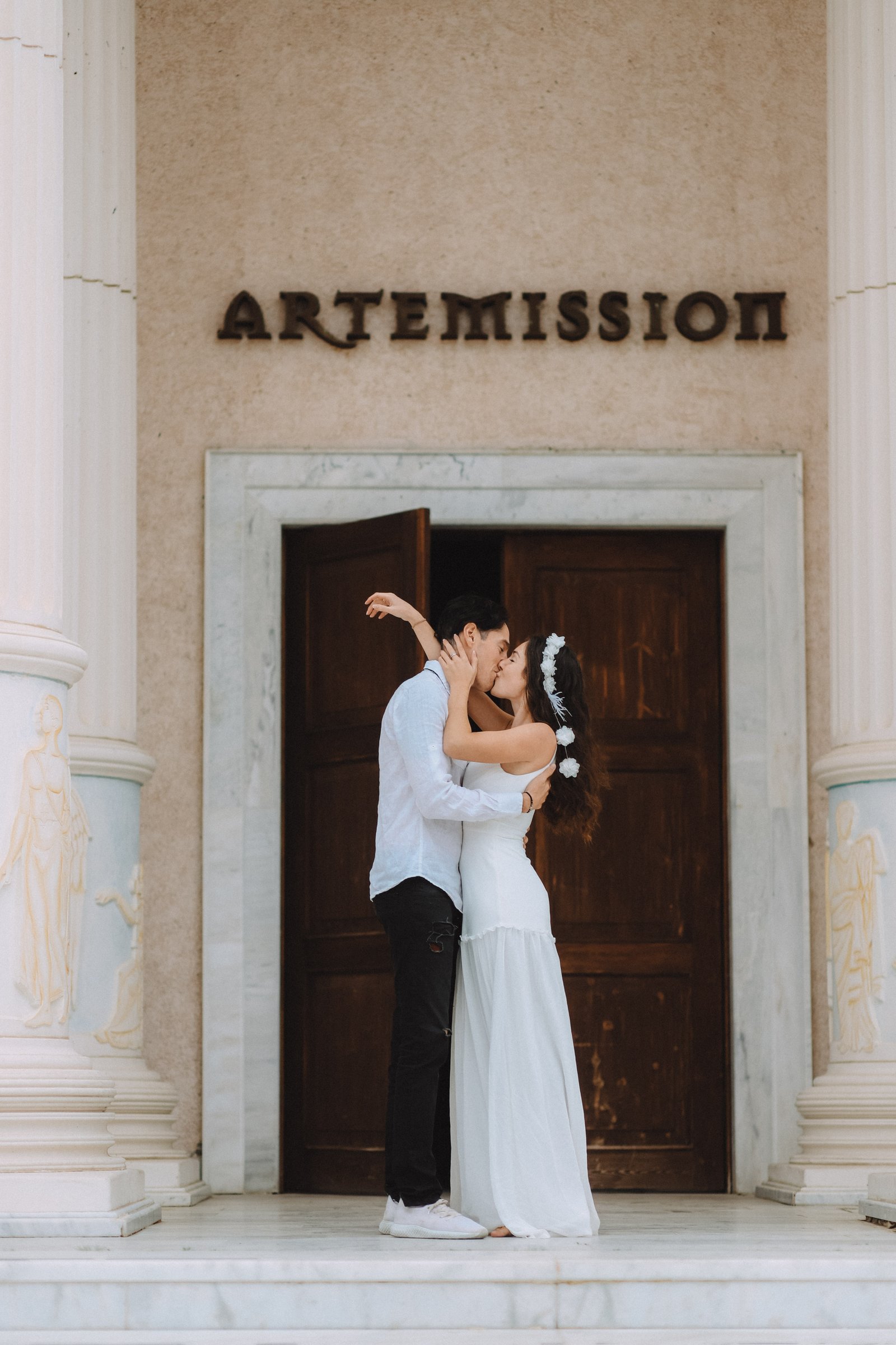 This elegant wedding session was captured in Kusadasi, Turkey, a destination known for its timeless architecture, warm light, and Mediterranean atmosphere. Surrounded by grand columns, soft tones, and natural elegance, Morganne and Yannick’s wedding portraits reflect a refined yet intimate celebration.