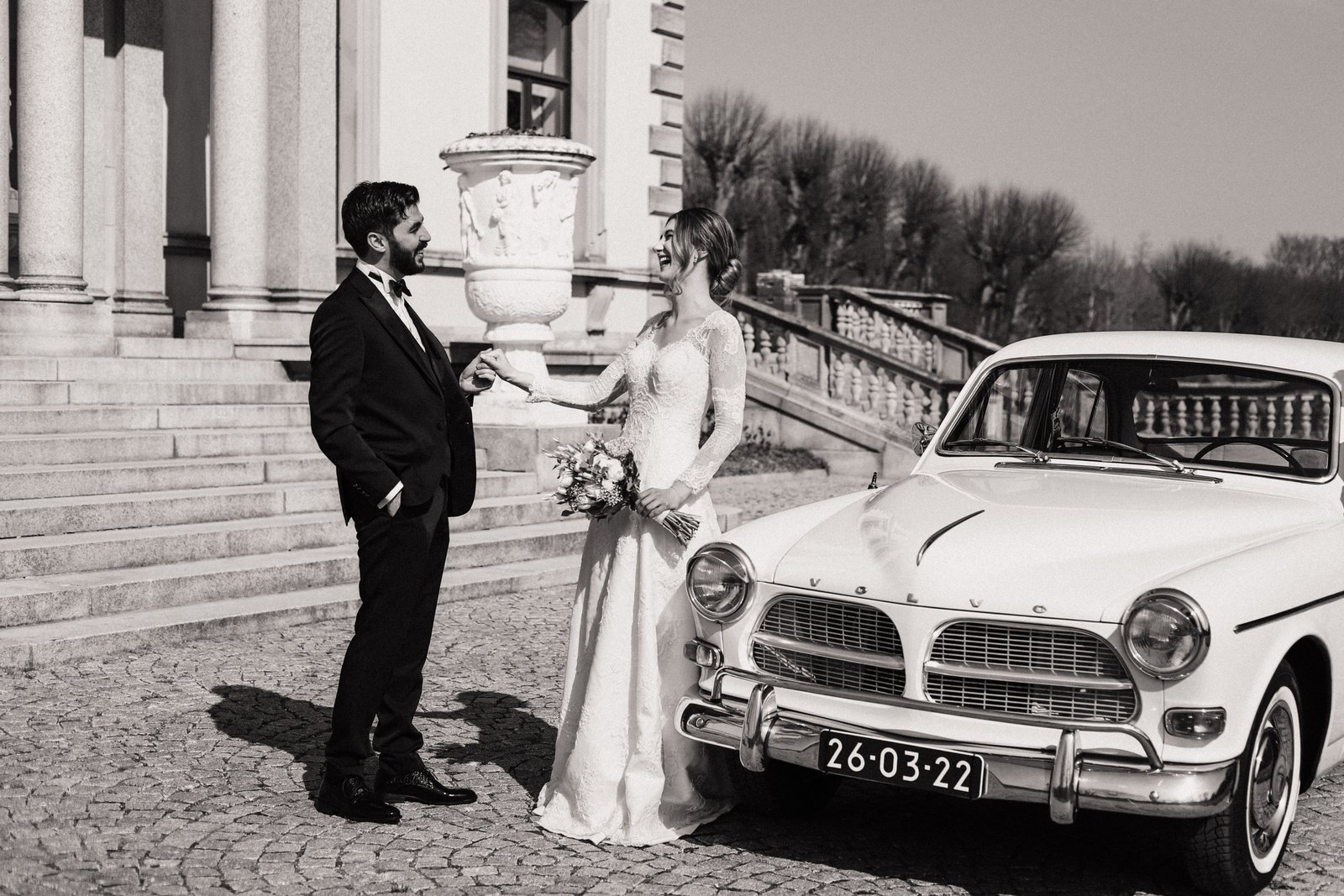 As a wedding photographer in the Netherlands, we focused on capturing genuine moments and elegant portraits, blending documentary-style photography with a classic editorial touch. From intimate moments inside the vintage car to graceful portraits on the steps of Elswout, every image tells a story of connection, love, and quiet confidence.